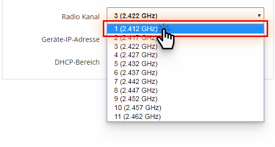 4. Unter dem Punkt Radio Kanal: Wählen Sie aus der Liste die Nummer des freien Kanals (in unserem Fall 1 oder 8)